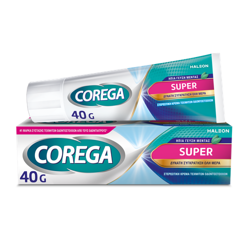 Η Corega Super προσφέρει 3D συγκράτηση που περιορίζει τη μετακίνηση της τεχνητής οδοντοστοιχίας προς όλες τις κατευθύνσεις (εμπρός/πίσω, πάνω/κάτω, πλευρικά) και βοηθά στη δυνατή συγκράτηση έως και 12 ώρες. Με ήπια γεύση μέντας και σύνθεση που εμποδίζει την εισχώρηση υπολειμμάτων τροφής, για άνεση στη διάρκεια της ημέρας.