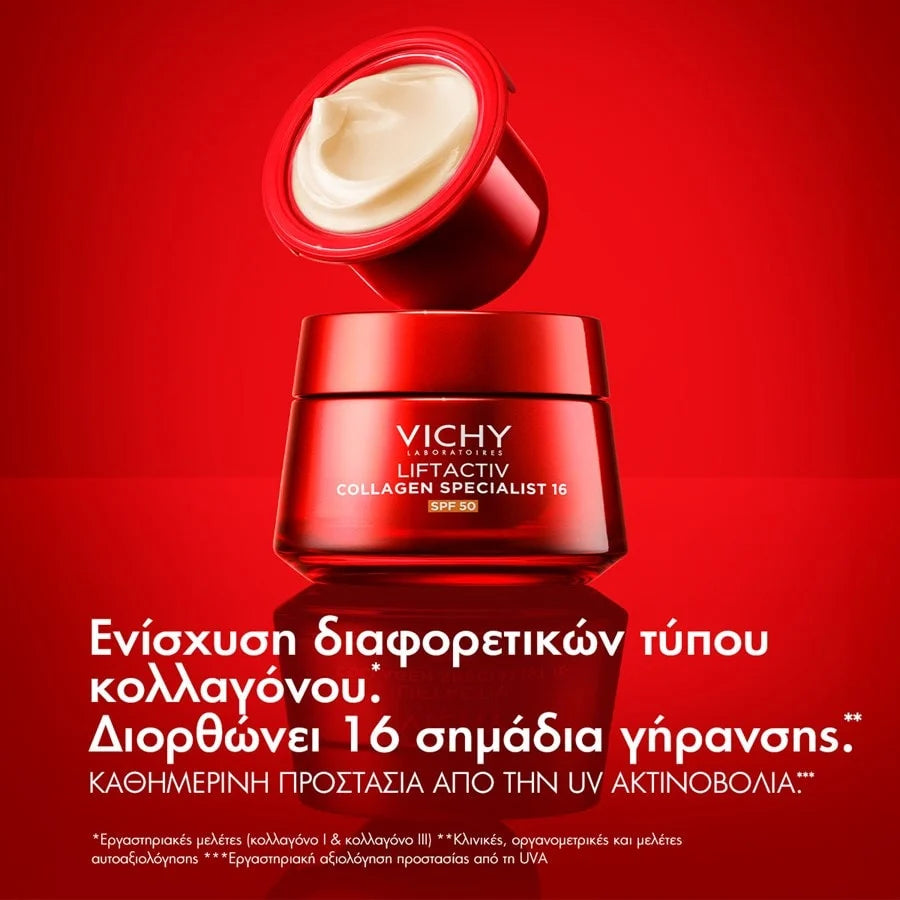 Η Vichy Liftactiv Collagen Specialist 16 SPF50 Day Cream είναι μια προηγμένη αντιγηραντική κρέμα προσώπου που ενισχύει όλους τους τύπους κολλαγόνου και προστατεύει την επιδερμίδα από την καθημερινή ακτινοβολία UV. Χάρη στη νέα αποκλειστική τεχνολογία Co-Bonding με Ραμνόζη, Πεπτίδια και Maitake, συμβάλλει στη δημιουργία ενός ισχυρότερου δικτύου κολλαγόνου, χαρίζοντας πιο σφριγηλή και νεανική όψη.