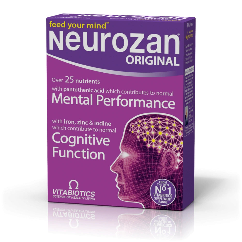 Το Neurozan Original της Vitabiotics είναι ένα εξειδικευμένο συμπλήρωμα διατροφής που συνδυάζει βότανα, αμινοξέα, βιταμίνες & ιχνοστοιχεία για να υποστηρίξει την πνευματική απόδοση, τη μνήμη και τη λειτουργία του εγκεφάλου. Περιλαμβάνει Ginkgo biloba, 5-HTP, γλουταμίνη, φωσφατιδυλοσερίνη/φωσφατιδυλοχολίνη, καθώς και συνένζυμο Q10, βιταμίνες C & E με αντιοξειδωτική δράση.